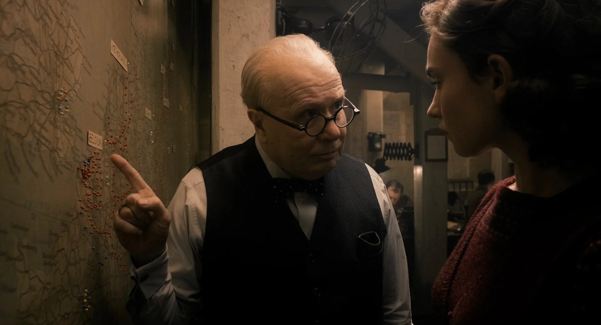 Cast: Gary Oldman as Winston Churchill, Kristin Scott Thomas as Clemmie, Ben Mendelsohn as King George VI, Lily James as Elizabeth Layton, Ronald Pickup as Neville Chamberlain, Stephen Dillane as Viscount Halifax, Nicholas Jones as Sir John Simon, Samuel West as Sir Anthony Eden, David Schofield as Clement Atlee, Richard Lumsden as General Ismay, Malcolm Storry as General Ironside, Hilton McRae as Arthur Greenwood, Benjamin Whitrow as Sir Samuel Hoare, Joe Armstrong as John Evans, Adrian Rawlins as Air Chief Marshal Dowding, David Bamber as Admiral Ramsay, Paul Leonard as Admiral Dudley Pound, David Strathairn as President Roosevelt (voice), Eric MacLennan as Tom Leonard, Philip Martin Brown as Sawyers, Demetri Goritsas as Cabinet Secretary Bridges, Jordan Waller as Randolph Churchill, Alex Clatworthy as Diana Churchill, Mary Antony as Mary Churchill, Bethany Muir as Sarah Churchill, Anna Burnett as Pamela Churchill, Jeremy Child as Lord Stanhope, Brian Pettifer as Lord Kingsley Wood, Michael Gould as Lord Londonderry, Paul Ridley as House of Commons Speaker, Robin Pearce as Ernle Hastings, Michael Bott as Equerry, Olivier Broche as Reynaud, Mario Hacquard as Daladier, Pip Torrens as BBC Producer, Edmund Wiseman as Actor, Hannah Steele as Abigail Walker, Nia Gwynne as Alice Simpson, Ade Dee Haastrup as Marcus Peters, James Eeles as Maurice Baker, Flora Nicholson as Jessie Sutton, Bronte Carmichael as Young Girl on Tube, Roisin O'Neill as Agnes Dillon, John Locke as Oliver Wilson, Joanna Neary as Margaret Jerome, Richard Glover as Brigadier Nicholson, Tom Ashley as Ramsay Staffer, Joshua Higgott as Reporter, Imogen King as Teenage Girl at Tube Map, Miles Gallant as Naval Map-Room Officer, Faye Marsay as Sybil, John Atterbury as Sir Alexander Cadogan, James Harkness as AD Nicholl (Secretary #1), Joshua James as W D Wilkinson (Secretary #2), Charley Palmer Rothwell as Christopher Wilson (Photographer), Patsy Ferran as Maid, Sarah Flind as Cook, Steffan Donnelly as Back Bencher, Kieran Buckeridge as Cecil Beaton, Johnny Otto as Member of Parliament (uncredited)