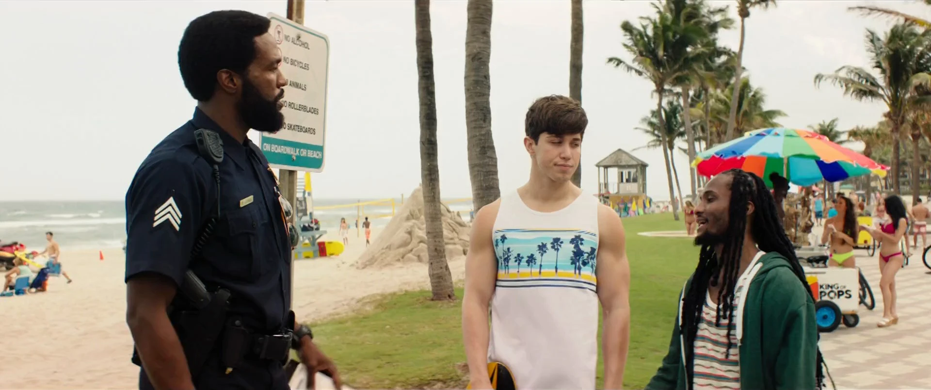 Cast: Dwayne Johnson as Mitch Buchanan, Zac Efron as Matt Brody, Priyanka Chopra Jonas as Victoria Leeds, Alexandra Daddario as Summer Quinn, Jon Bass as Ronnie Greenbaum, Hannibal Buress as Dave the Tech, Kelly Rohrbach as C.J. Parker, Ilfenesh Hadera as Stephanie Holden, Yahya Abdul-Mateen II as Sgt. Ellerbee, Oscar Nunez as Councilman Rodriguez, Rob Huebel as Captain Thorpe, Amin Joseph as Frankie, Jack Kesy as Leon, Pamela Anderson as Casey Jean Parker, David Hasselhoff as The Mentor, Clem Cheung as Murray Chen, Belinda as Carmen, Charlotte McKinney as Julia, Izabel Goulart as Amber, Arian Foster as Himself, Vernon Davis as Himself, Eros Exarhiou as Frosty, Maxie G. Rosales as Pier Teenage Girl, Karin Silvestri as Pier Mom, Vincenzo Hinckley as Pete, Brandon Larracuente as Skateboarder #1, Kelvin Witherspoon as Skateboarder #2, Welder Santos as Huntley Club Member, David Weiss as Cell Phone Customer, Damien LaRoy as Kite Surfer, Peter Anaya as Huntley Waiter, Louis John Ruth as Pier Boy, Brenda Lowe as Surfer, Jackson Geach as Billy, Brandon Lee as Scull Rower, James A. Sutton as Huntley Security Guard, Juliette Mathis as High Chair Baby Girl, Samantha Harris as Interviewer, Seth Gordon as Helicopter Pilot, John Cenatiempo as Sergeant (uncredited), Shay Davila as Bikini Girl (uncredited), Bria Danielle Davis as Beach Goer (uncredited), Ana Flavia Gavlak as Lifeguard (uncredited), Whitney Goin as Doctor (uncredited), Apollo GT as Beach Goer (uncredited), Lee Hodge as Lifeguard (uncredited), Angelique Kenney as Surfer beach babe (uncredited), Matthew Kosto as Shark Bite Boy (uncredited), Gage Lawson as Beachgoer (uncredited), Casey McCullum as Beach Goer (uncredited), Logan Paul as Zane (uncredited), Earl Poitier as The Kitchen Worker (uncredited), Damon Preston as Lifeguard #1 (uncredited), Kelly Róisín as Party Goer / Beach Goer (uncredited), Cody Scott as Crewman (uncredited), Haviland Stillwell as Allegre (uncredited), Zachary Vazquez as Lifeguard (uncredited), Barbara Vincent as Yachter (uncredited), Maegan Vogel as Bikini Model (uncredited), Acoryé White as Kitchen Staff (uncredited)